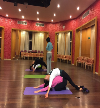 接下来,大家在温馨的气氛中开启瑜伽之旅。本次活动邀请了瑜伽教练林文佳老师为大家教授基础瑜伽,并针对老师们长期伏案进行了肩颈理疗的专业指导。林老师教大家在呼吸和冥想中释放工作、学习的压力;打开肩胸、柔韧脊柱给身体创造更多的空间……用瑜伽冥想和体式为大家诠释处在当下、放松身心。