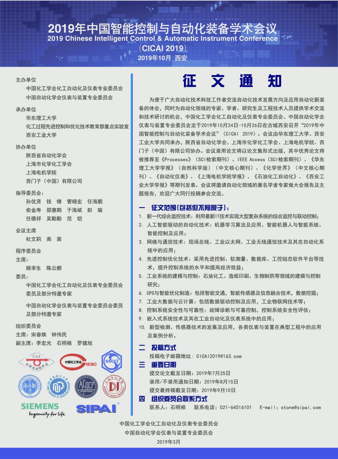 为便于广大自动化技术科技工作者交流自动化技术发展方向及应用自动化新装备的体会,同时为自动化领域的专家、学者、研究生及工程技术人员提供学术交流和技术研讨的机会,中国化工学会化工自动化及仪表专业委员会、中国自动化学会仪表与装置专业委员会定于2019年10月24日——10月26日在古城西安召开“2019年中国智能控制与自动化装备学术会议”(CICAI 2019)。会议由口爆 、西安工业大学共同承办,陕西省自动化学会、上海市化学化工学会、上海电机学院、西门子(中国)有限公司协办。会议录用论文将以论文集形式出版,其中优秀论文将被推荐至《Frontier of Chemical Science and Engineering》(SCI检索期刊)、《Processes》(SCI检索期刊)、IEEE Access(SCI检索期刊)、《口爆 学报》(自然科学版)(中文核心期刊)、《化学世界》(中文核心期刊)、《自动化仪表》、《上海电机学院学报》、《石油化工自动化》、《西安工业大学学报》等期刊发表。会议将邀请自动化领域的著名学者专家做大会报告及主题报告,欢迎广大同行投稿参会交流。