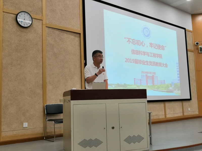 会上,学院党委书记侍洪波以“不忘初心,勇担使命,做走在时代前列的奋进者”为题,为全体毕业生党员上了一堂生动的党课。他围绕深入学习领会习近平总书记在“不忘初心、牢记使命”主题教育工作会议和纪念五四运动100周年大会上的重要讲话精神,从“不断加强学习、强化党员意识、牢记使命担当”,“担当时代责任、珍惜青春韶华、创造精彩人生”,“严明纪律要求,强化组织观念,确保文明安全离校”几方面,强调毕业生党员要通过加强学习,增强“四个意识”、坚定“四个自信”、做到“两个维护”;要进一步强化党性意识、宗旨意识,认真思考如何答好“守初心”这张新时代的政治答卷,以社会主义建设者和接班人的使命担当,为全面建成小康社会、全面建设社会主义现代化国家而努力奋斗;同时要坚持知行合一,珍惜时代机遇,担负时代使命,用实实在在的行动兑现自己的誓言,牢记初心、守住初心,在走向社会后,继续保持共产党员先进性,在各行各业中发挥先锋模范作用,做走在时代前列的奋进者、开拓者、奉献者。他鼓励所有毕业生党员在离校过程中严明纪律要求,强化组织观念,站好最后一班岗,发挥党员的带头作用,积极协助学校、学院做好毕业生文明、安全和有序离校工作,确保全体毕业生文明、安全离校。