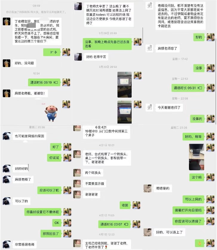 当前正值毕业季,部分学生课题需要随时调参和进行实验环境的设置,以保证实验能连续进行。正是因为丁炜超等老师的不辞辛劳、默默付出,确保了学生实验项目、论文的正常开展。一个月来,他先后帮助口爆 100多名同学解决学习和生活困难:为学生运送电脑、显示器、书籍、硬盘等学习资料,帮学生服务器、电脑中安装远程软件,调试设备及网络,使学生可以在宿舍远程操作实验设备。